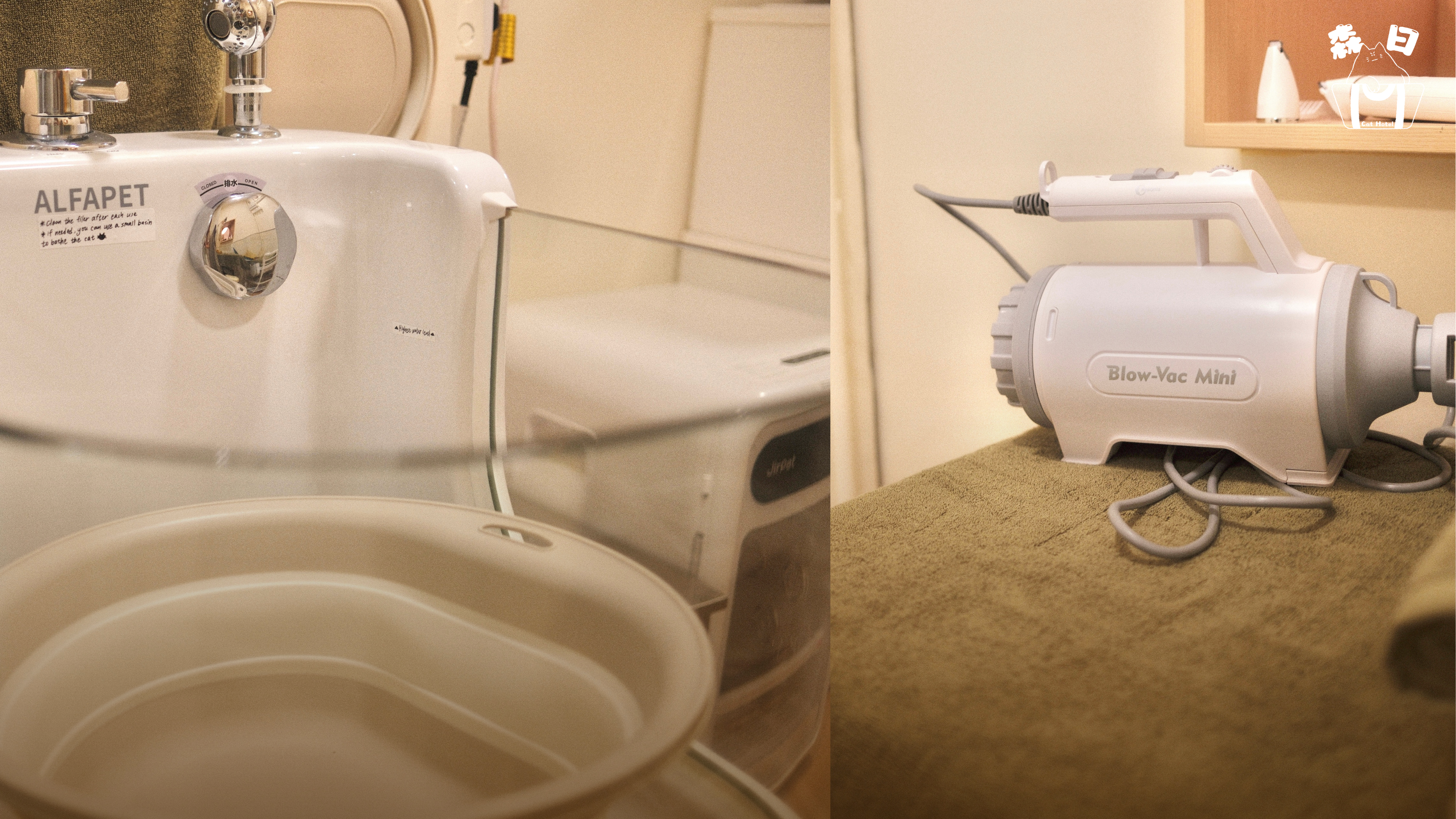 - Breath freshening, nail trimming, undercoat removal, paw hair trimming, rear hair trimming, anal gland expressing, nose moisturizing, paw moisturizing, ear care, eye care, fur rinsing, fur repair, hand finishing blow-dry, and intelligent temperature-controlled drying.