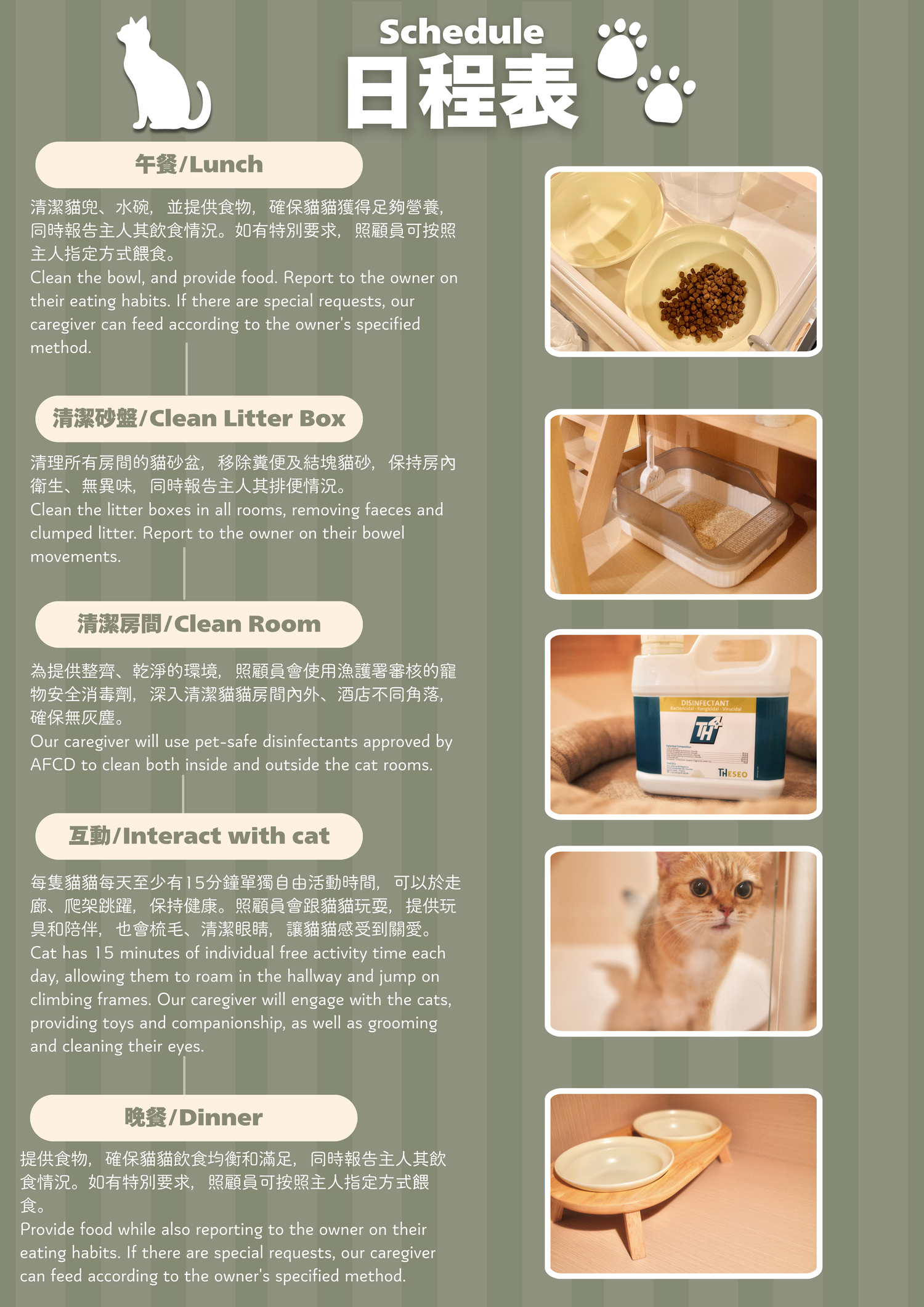 - 每日照顧員會同貓貓有獨立互動時間, 一次只放一隻貓貓 / 一個家庭的貓貓